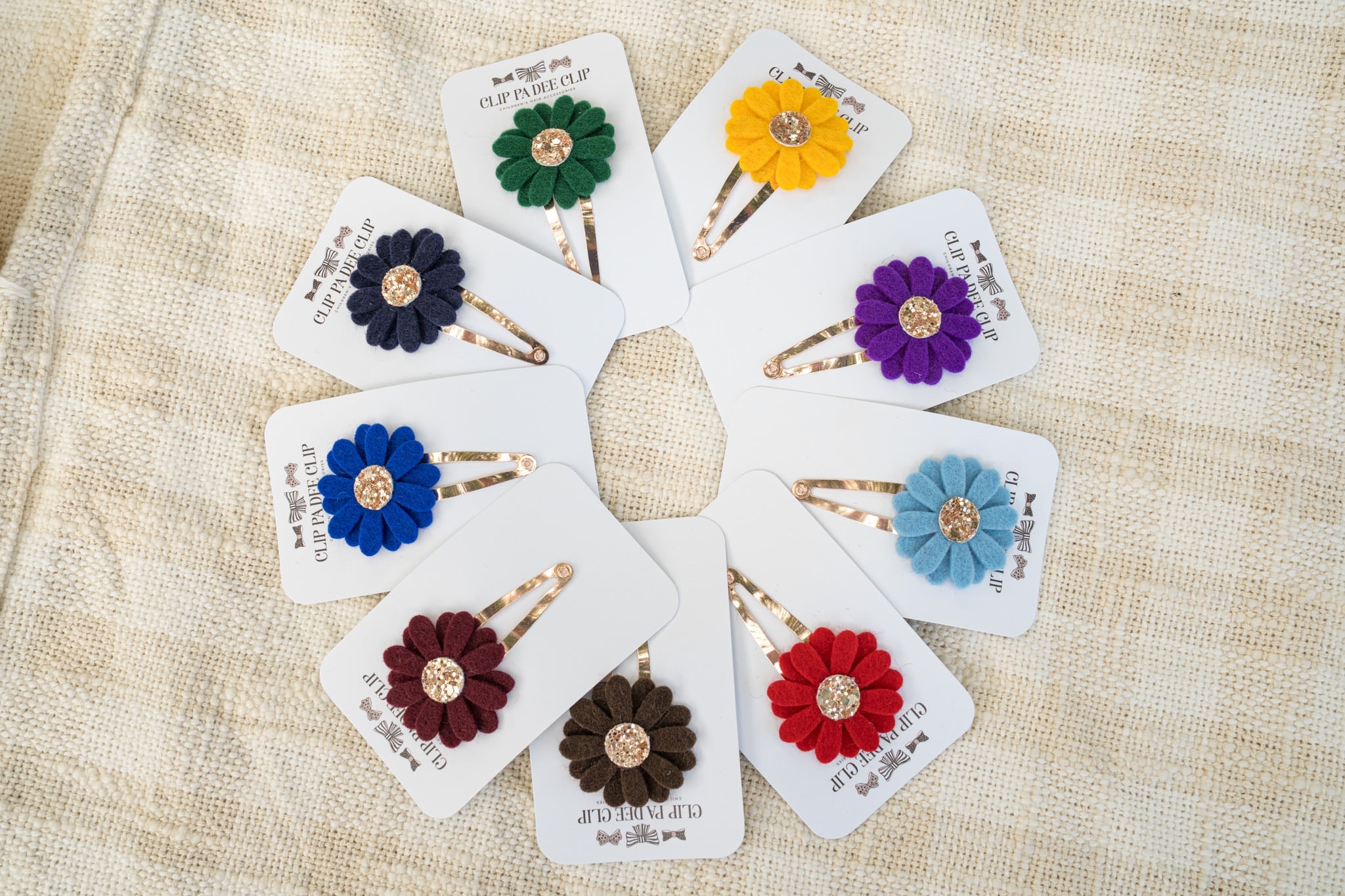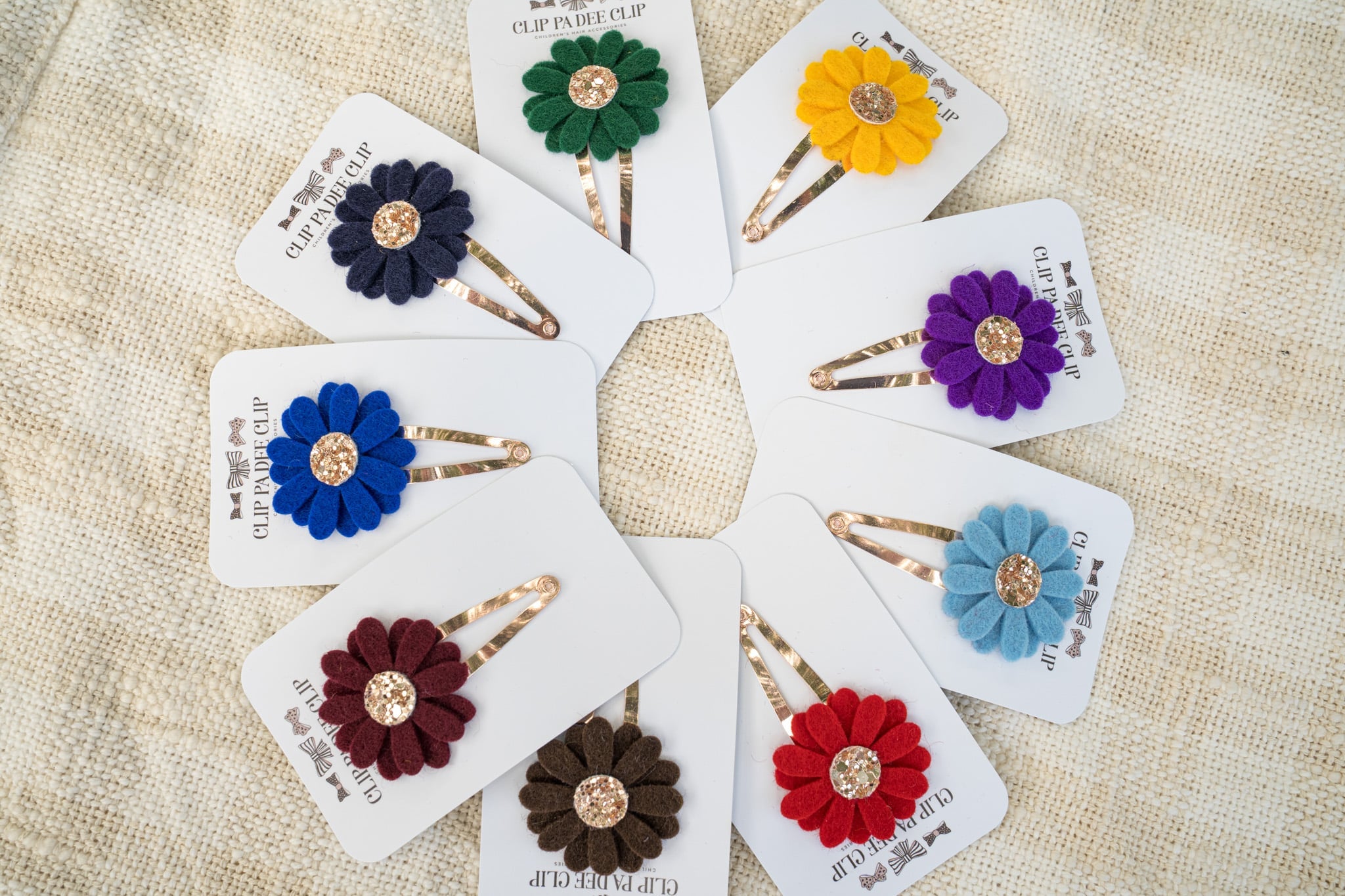 DESCRIPTION Jessie Blossom (Daisy Felt Flower) - School Colours
