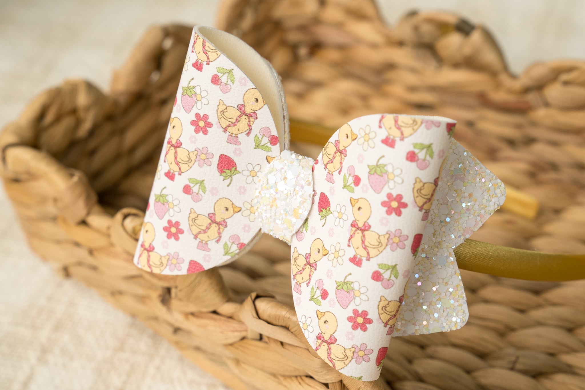 MATERIAL White duck, strawberry, cherry floral print faux leatherette and white, beige chunky glitter and matching yellow satin hard headband.